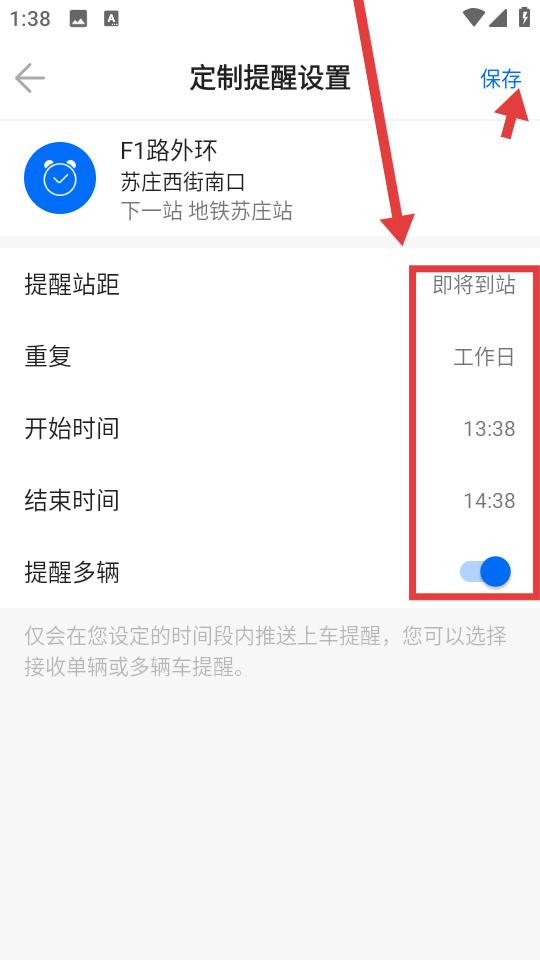 3、定制提醒設置頁面顯示F1路外環蘇莊西街南口站點,可設置提醒站距、重復時間等參數,提醒多輛功能可開啟,點擊保存按鈕完成個性化公交提醒設置。