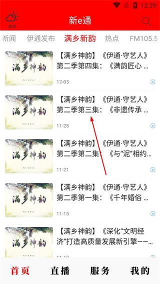 1、打開新e通軟件,進入首頁找到滿鄉神韻板塊,瀏覽該板塊下的節目列表,選擇想要觀看的節目內容。