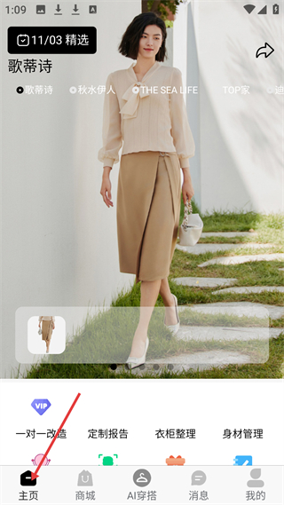 2、主頁板塊,展示歌蒂詩、秋水伊人等品牌穿搭案例,提供一對一改造、定制報告等服務入口,呈現時尚穿搭風格。