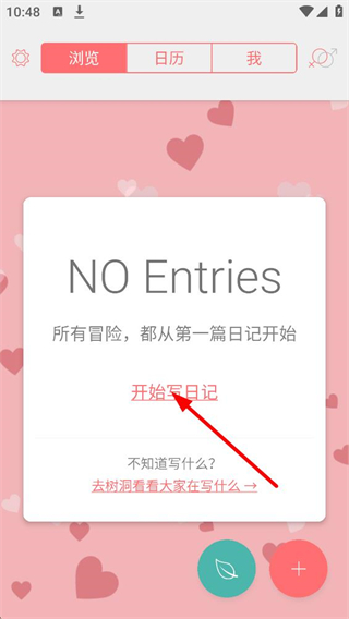 3、進入日記瀏覽界面,若沒有日記可點擊開始寫日記,也可去樹洞看看大家在寫什么,開啟日記創作的第一步。