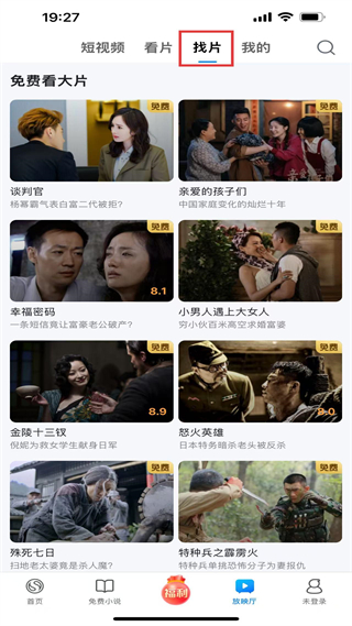 4、找片界面是影視分類推薦頁,展示免費影視劇資源,適配長視頻篩選觀看需求,提供多樣化影視選擇。