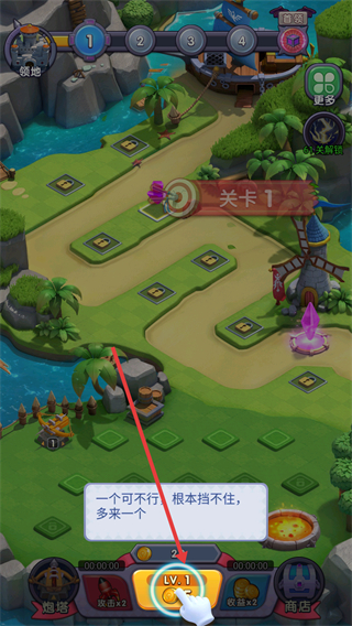 1、進入游戲后在關卡選擇界面選擇關卡進入游戲場景,點擊LV1等區域消耗金幣召喚初級炮塔,并將炮塔放置在合適的位置。