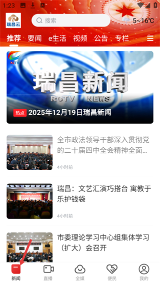 1、進入后看到新聞界面,有推薦要聞等分類,展示瑞昌新聞及政法干部學習等資訊,底部設新聞直播等導航按鈕,便于切換不同功能板塊。