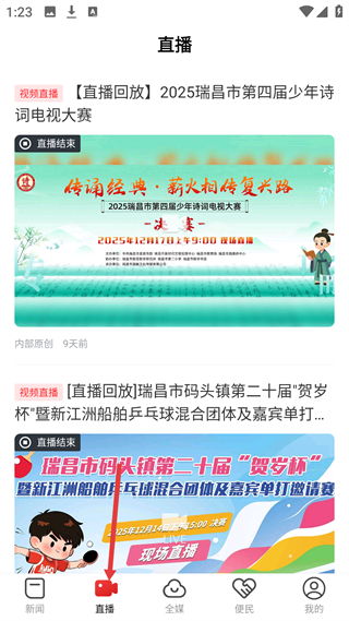 2、點擊直播按鈕進入對應頁面,查看直播回放內容,含少年詩詞電視大賽、乒乓球賽等活動的回放,可了解各活動的舉辦信息。