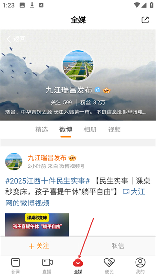 3、點擊全媒按鈕進入對應頁面,查看九江瑞昌發布的內容,含民生實事相關微博動態,還可關注該賬號獲取更多官方發布信息。