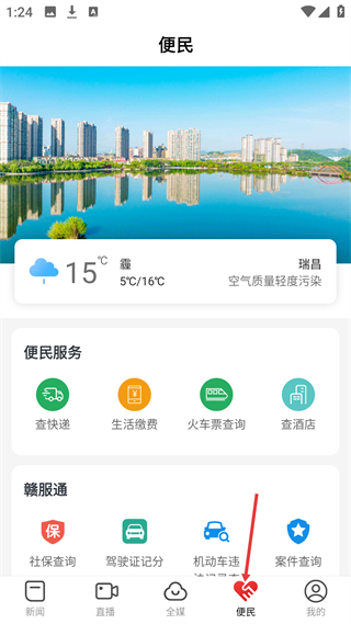 4、點擊便民按鈕進入對應頁面,能查看當地天氣,使用查快遞生活繳費等便民服務,還有社保查詢等贛服通相關政務服務功能。