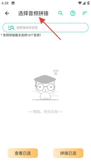 4、音頻拼接是操作頁,限制最多選10個音頻,支持搜索選擇,適配多段組合場景,滿足長音頻制作需求。