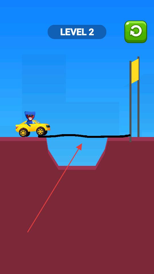 2、畫好橋后汽車會自動行駛,操控汽車沿著畫好的橋前進,順利通過懸崖,到達帶有旗幟的目標位置,完成當前關卡。