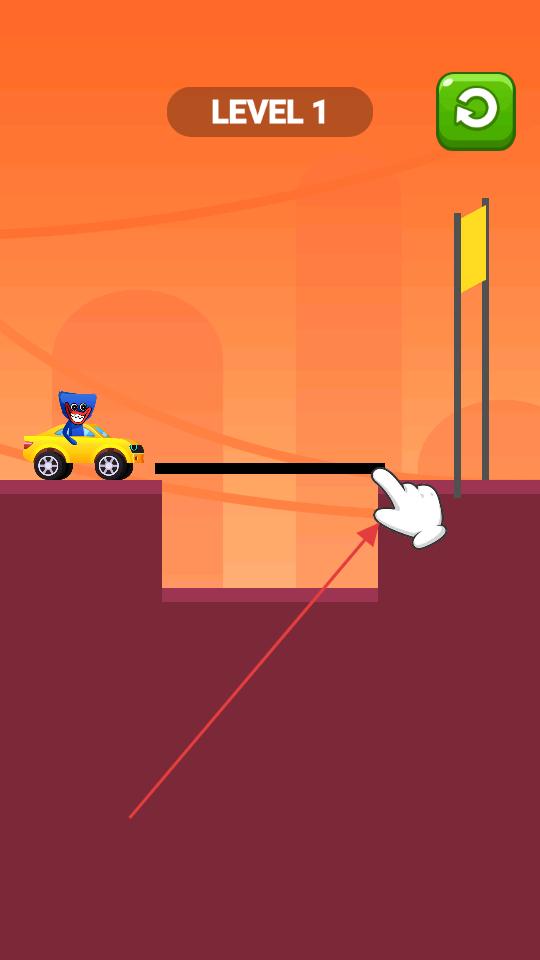 1、進入游戲看到汽車與懸崖的場景,根據提示,用手指在屏幕上畫出線條,搭建一座能讓汽車通過的橋,為汽車通行創造條件。