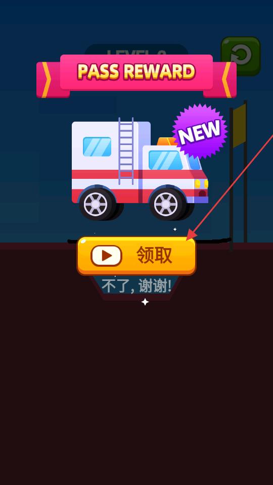 4、成功通關后會出現獎勵界面,若想獲取新的車輛等獎勵,點擊領取按鈕獲取獎勵后,可繼續挑戰后續關卡。
