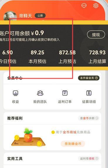 1、返利或收益類界面,用戶名為帝釋天有今日、本月、上月預估收入及上月結算數據,還有會員中心、收益等功能入口。