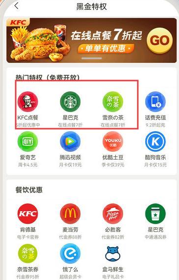 2、APP的黑金特權界面,提供KFC、星巴克、奈雪的茶等熱門品牌在線點餐7折起優惠,以及愛奇藝、騰訊視頻等會員充值優惠。