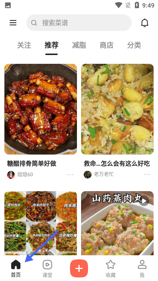 1、首頁搜索便捷推薦豐富菜譜,像糖醋排骨等誘人菜品展示其中,底部導航清晰,輕松切換功能區開啟美食探索之旅。