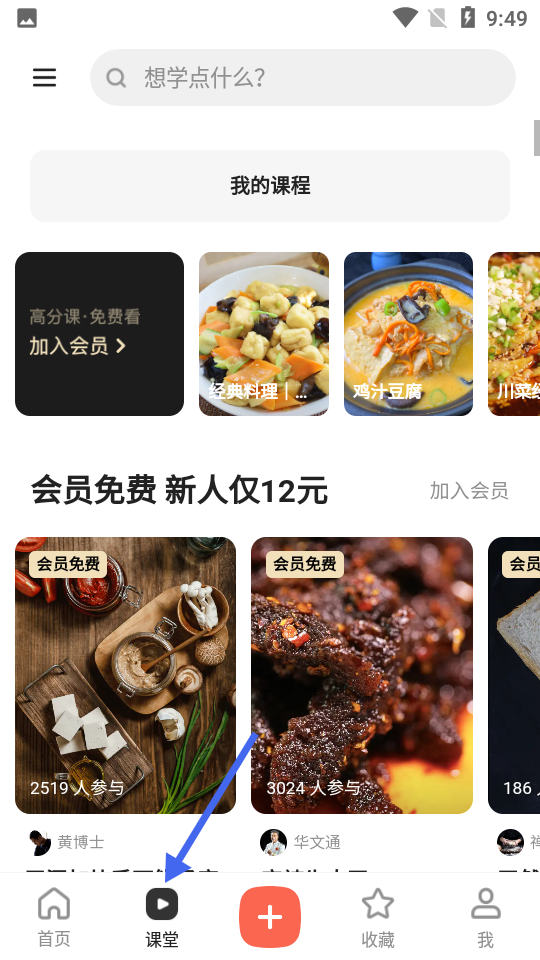 2、課堂界面聚焦美食課程搜索助力精準找課,我的課程有序陳列會員優惠醒目,經典課程直觀呈現滿足廚藝提升需求。