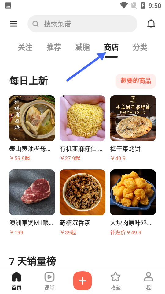 3、商店頁面商品琳瑯滿目,每日上新展示多樣食材與美食,從泰山黃油老母雞到有機亞麻籽仁銷量榜單為選購提供參考。