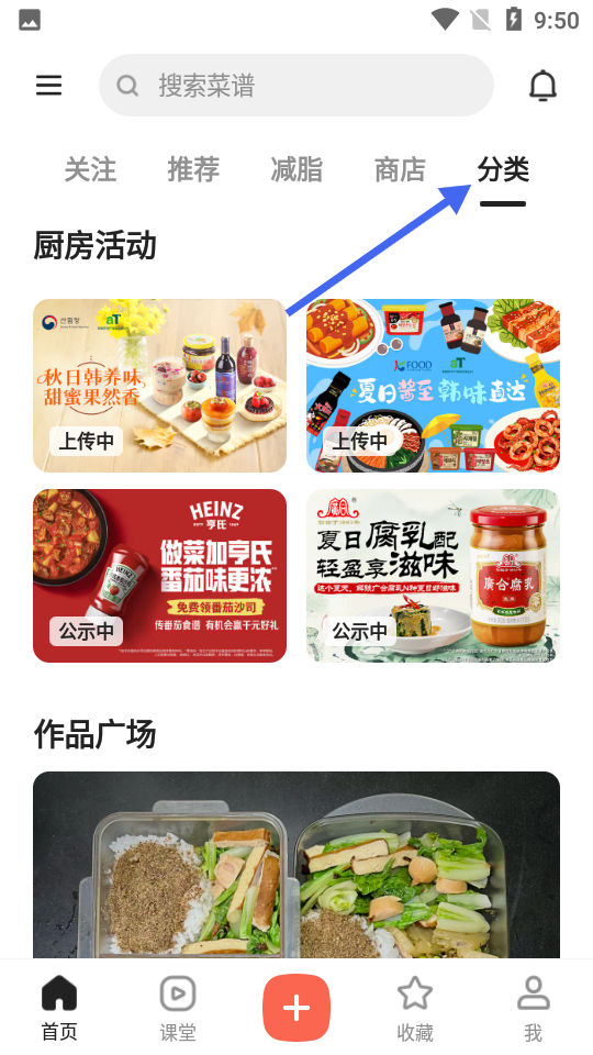 4、分類頁面整合廚房活動與作品廣場活動海報吸睛,如秋日韓養味等活動待參與,作品廣場呈現精彩美食創作激發烹飪靈感。