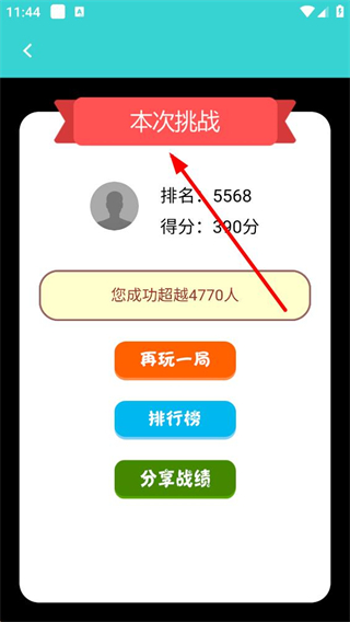 4、挑戰結束后會顯示本次挑戰的排名和得分,還能看到超越人數,可選擇再玩一局排行榜或分享戰績,繼續參與或查看排名。