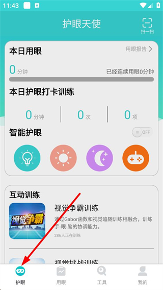 1、進入護眼界面,可查看本日用眼時長及護眼打卡訓練數據,還能找到智能護眼功能和互動訓練板塊,視覺爭霸訓練就在其中。