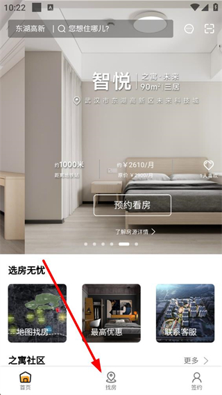 1、進入之寓首頁可查看房源信息,如智悅三居的租金、位置等內容,底部點擊找房選項,即可進入找房頁面,瀏覽更多房源列表。