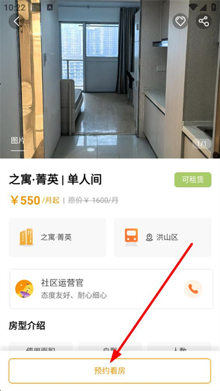 3、進入房源詳情頁能查看房型介紹、社區運營官等信息,確認房源后點擊預約看房按鈕,即可觸發登錄相關流程,準備完成預約操作。