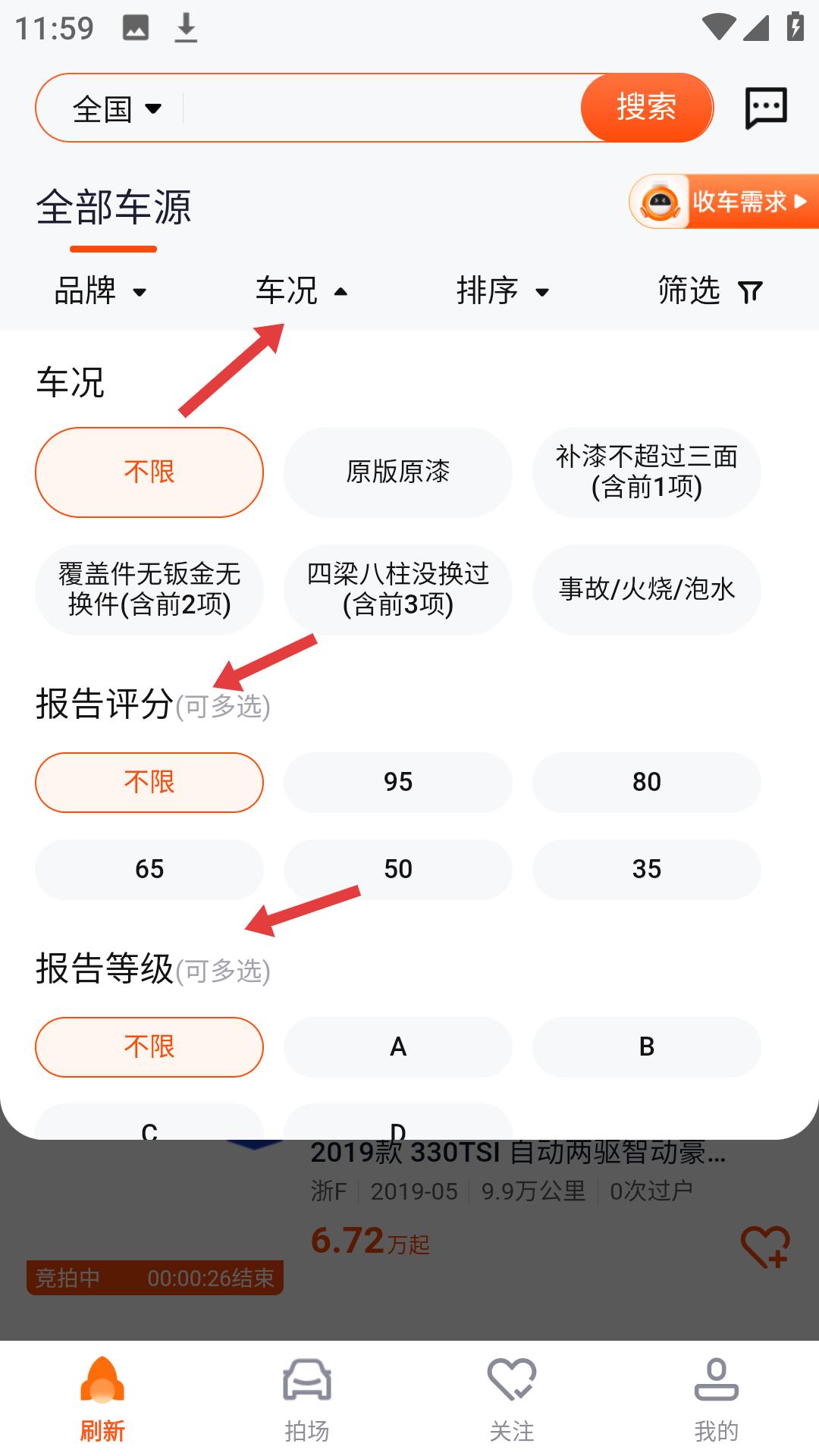 4、在全部車源頁面,點擊車況選項,可根據車況、報告評分、報告等級等條件進一步篩選車源,找到符合要求的汽車。