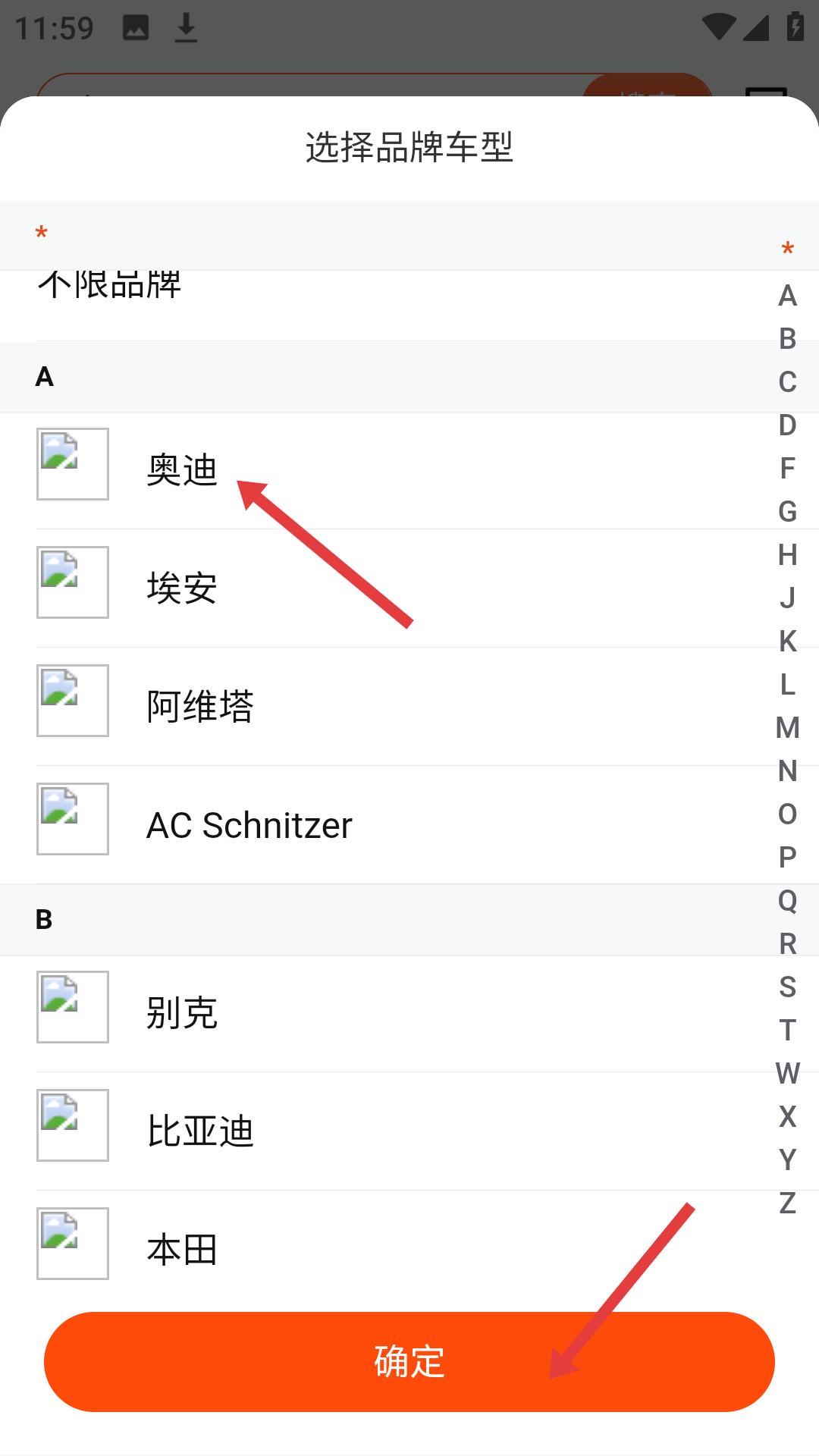 2、進入品牌車型選擇界面后,選擇想要的汽車品牌,點擊確定按鈕,完成品牌篩選,查看該品牌的車源。