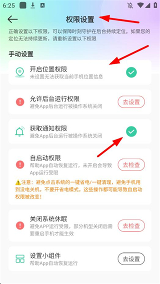3、需開啟位置權限、獲取通知權限,還得設置允許后臺運行權限、自啟動權限、關閉系統休眠,保障后臺持續定位。