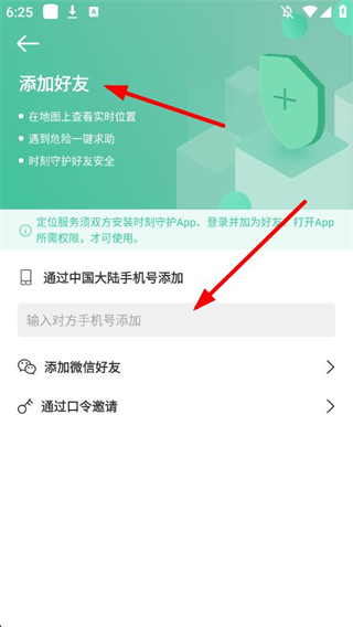 4、在對應輸入框填入對方手機號,也能選添加微信好友或通過口令邀請,雙方需都安裝該App并加好友才能用定位服務。