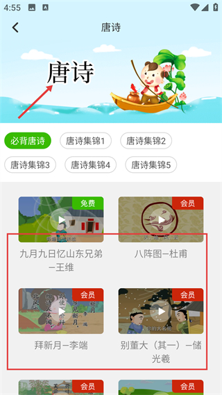 2、唐詩模塊頁面,分必背、集錦等分類,展示經典詩作,含免費與會員內容,助力小學唐詩積累。