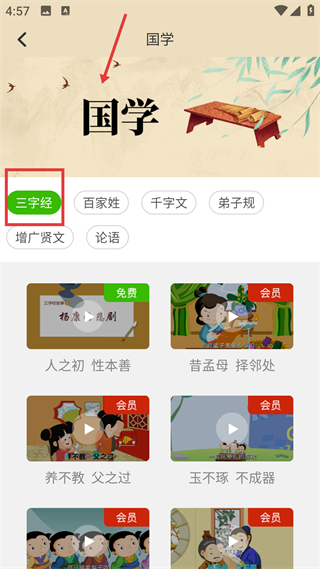 3、國學模塊頁面,覆蓋三字經等經典內容,展示三字經片段,含免費與會員資源,適配小學國學啟蒙。