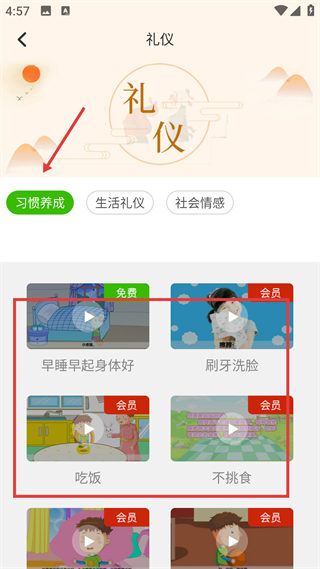4、禮儀模塊頁面,分習慣養成等分類,展示生活禮儀內容,含免費與會員資源,助力小學禮儀培養。