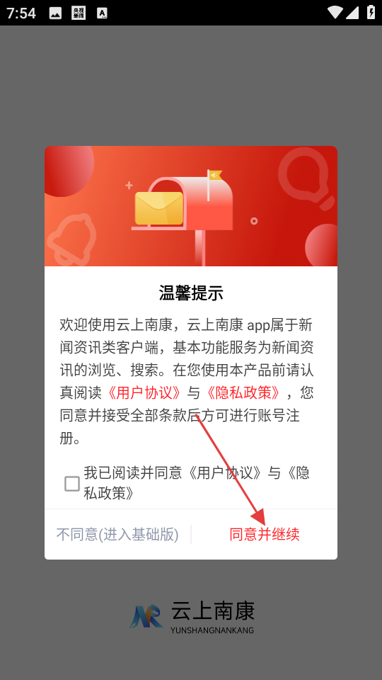 1、首次打開APP會彈出用戶協議及隱私政策界面,需仔細閱讀后點擊同意才能繼續使用APP,這一步是為了確保用戶了解并同意平臺使用個人信息的規則。