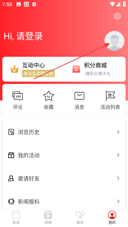 4、點擊我的選項進入頁面,看到Hi請登錄提示,還有互動中心積分商城等板塊,登錄后可使用評論收藏等功能,查看瀏覽歷史與我的活動內容。