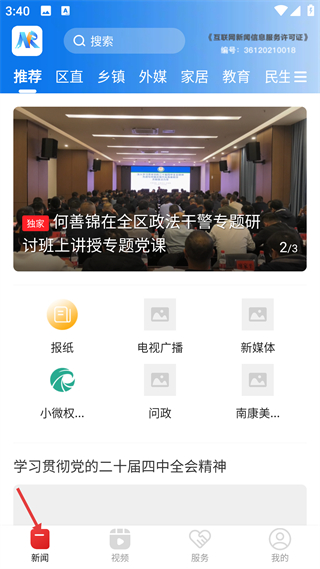 1、進入新聞頁面,看到推薦區直鄉鎮等資訊分類,還有報紙電視廣播新媒體等功能入口,可瀏覽各類資訊內容,開啟融媒信息的探索之旅。