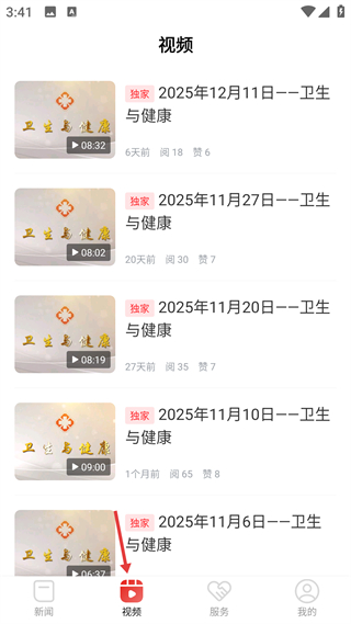 2、點擊視頻選項進入對應頁面,能看到多條衛生與健康相關的視頻內容,每條視頻標注發布時間閱讀量點贊數,可選擇視頻點擊播放查看詳情。
