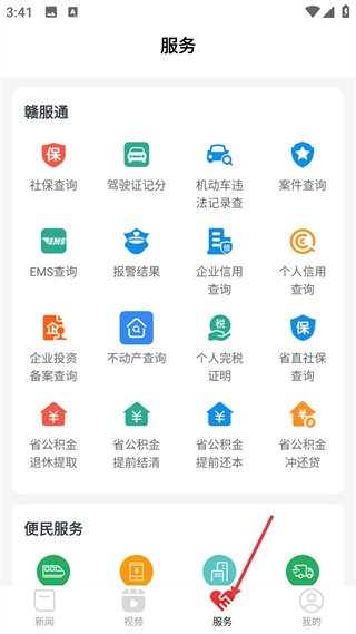 3、點擊服務選項進入頁面,有贛服通板塊含社保查詢駕駛證記分等功能,還有便民服務板塊,可按需使用各類服務功能,獲取實用的便民幫助。