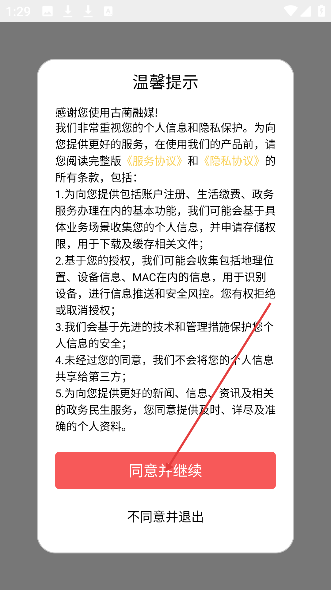 1、首次打開APP會彈出用戶協議及隱私政策界面,需仔細閱讀后點擊同意才能繼續使用APP,這一步是為了確保用戶了解并同意平臺使用個人信息的規則。
