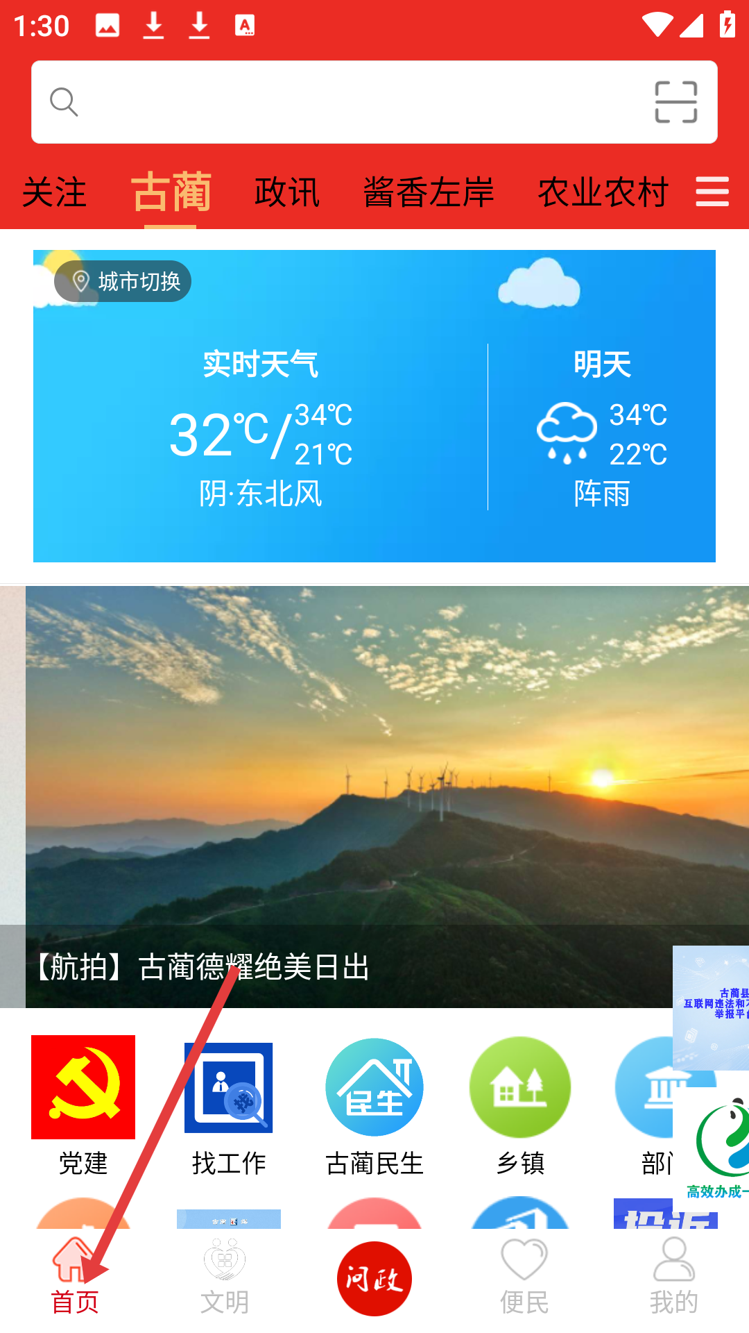 3、成功登錄后就會進入APP的首頁,這里有關注、古藺等欄目,還顯示實時天氣、各類資訊,下方有黨建、找工作等功能入口,可瀏覽本地新聞、使用便民服務。