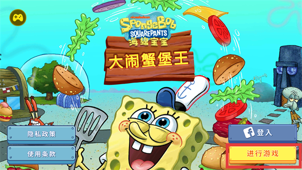 1、玩家下載游戲之后在游戲主界面,點擊進行游戲按鈕進入蟹堡王餐廳的經營場景,開啟為顧客制作美食的挑戰。