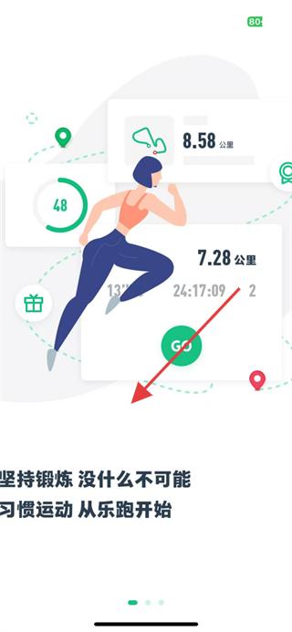 1、進入軟件啟動頁面瀏覽堅持鍛煉等運動激勵內容,了解軟件的運動理念,開啟運動軟件的使用流程,準備進行運動記錄。