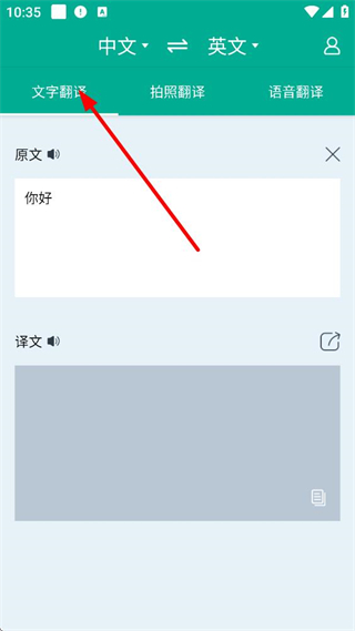 1、文字翻譯功能中,可選擇中文與英文互譯,原文框輸入文字如你好,譯文框會呈現對應的翻譯結果,滿足基礎文字翻譯需求。