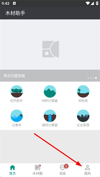 1、進入首頁可看到檢尺助手機積計算器等功能入口,這些工具適配木材行業需求,能輔助完成檢尺、材積計算等工作,底部導航欄可切換至其他板塊。