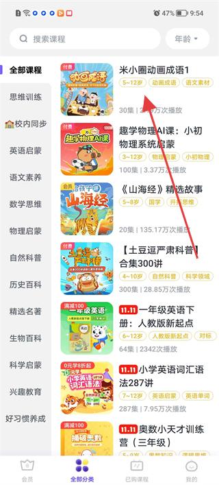 3、進入全部分類頁面查看思維訓練、校內同步等課程分類,如米小圈動畫成語、越學物理AI課等,了解課程的適合年齡與播放量,挑選喜歡的課程,開啟學習之旅。