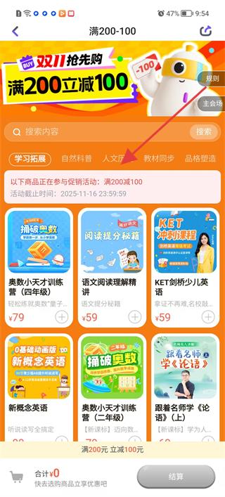 2、參與滿200100活動,瀏覽學習拓展、自然科普等分類課程,如奧數小天才訓練營、語文閱讀提分秘籍等,挑選感興趣的課程,參與優惠活動,提升學習性價比。