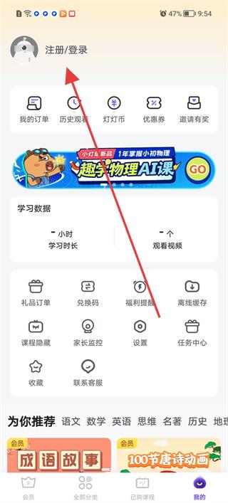 4、進入我的頁面點擊注冊登錄,管理我的訂單、歷史觀看等賬戶信息,查看學習數據與禮品訂單等,同時使用課程隱藏、家長監控等功能,全面管理學習與賬戶,提升使用體驗。