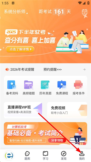1、進入軟考備考助手首頁,可見距考試倒計時及備考資料等功能入口,點擊底部我的按鈕,進入個人中心界面。