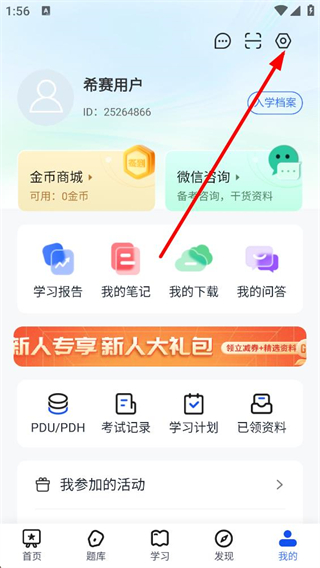 2、個人中心界面,顯示用戶信息與學習報告等功能板塊,點擊右上角設置圖標,進入設置操作頁面。