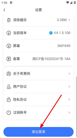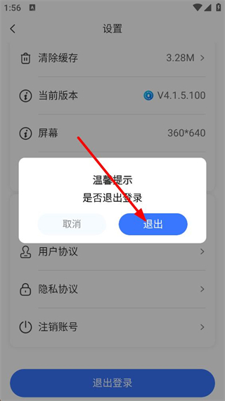 3、進入設置頁面,包含清除緩存、當前版本等選項,點擊底部退出登錄按鈕,彈出退出確認的提示框。
