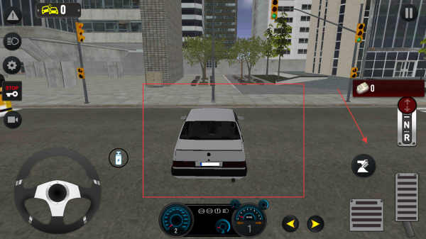 2、進入游戲后通過屏幕上的方向盤圖標控制汽車轉向,利用右側的換擋按鈕切換擋位,并配合油門和剎車踏板圖標來控制汽車的行駛與停止。