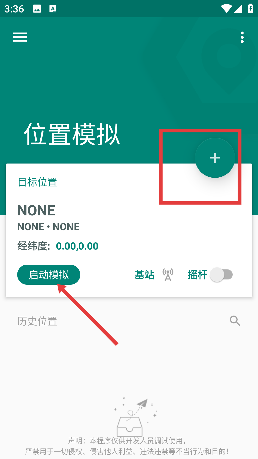 1、打開應用進入位置模擬主界面,這里有目標位置顯示區、啟動模擬按鈕,還有右上角的加號添加按鈕,若要開始模擬定位先點擊啟動模擬,觸發運行模式選擇流程。